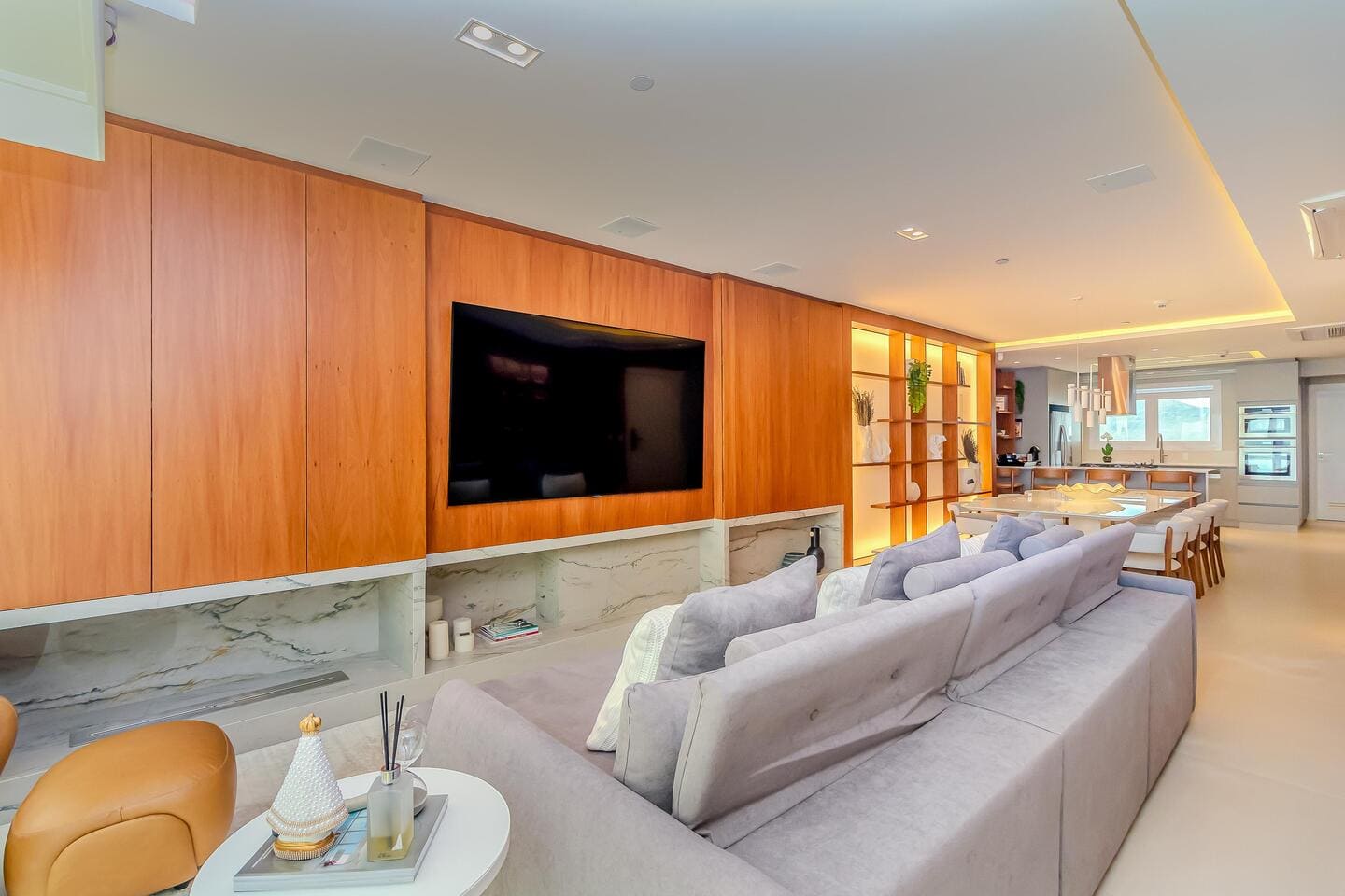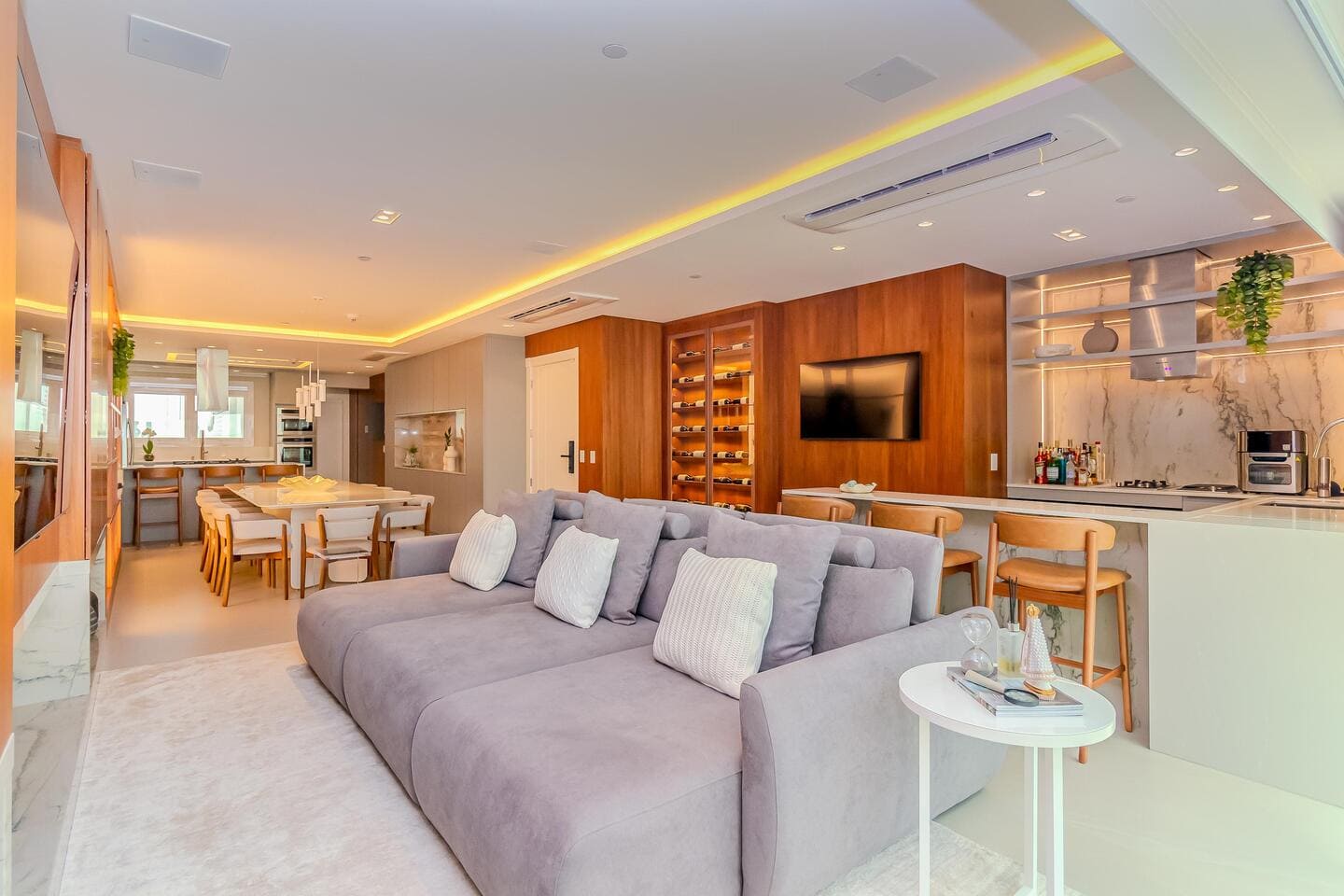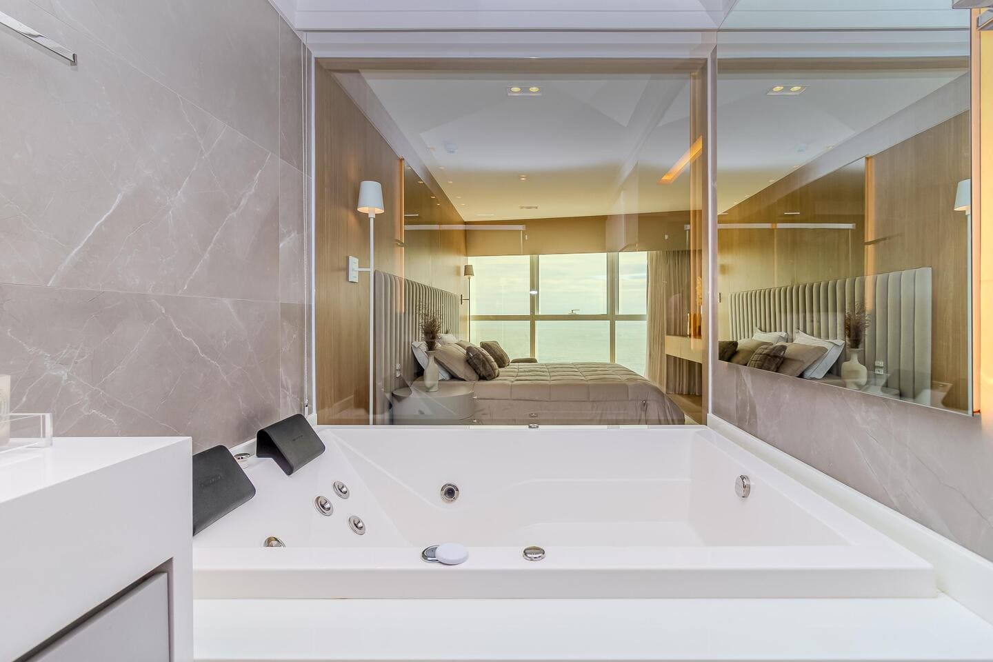 O Apartamento Mobiliado no Edifício One Tower, em Balneário Camboriú, traduz a maturidade de um projeto que alia tecnologia residencial, design contemporâneo e localização privilegiada. Com ambientes integrados e vista panorâmica do Atlântico, o living central conecta-se à cozinha gourmet e à área social, favorecendo fluidez e convivência. As quatro suítes foram desenhadas para o conforto absoluto, com destaque para as duas frente mar, equipadas com banheira de hidromassagem e amplas aberturas de vidro.